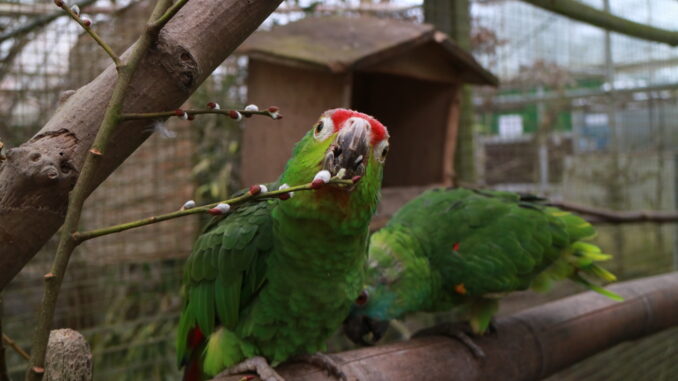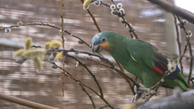 Seitdem die Temperaturen steigen, halten sich unsere Papageien nur nachts in den Schutzhäusern auf. Antonia, Pancho, Bimbo, Fidelio, Lora B. und Charly genießen – wie auch all die anderen Papageien, die im Fluggehege leben – am Tage den Sonnenschein und die schon fast frühsommerliche Wärme in den Flughallen. Sie zupfen Weidenkätzchen ab, nagen an der Rinde frischer Äste, untersuchen den Boden und genießen es, ausgiebig fliegen zu können. Besonders erfreulich ist, dass alle Papageien den Winter wohlbehalten und ohne gesundheitliche Beeinträchtigungen überstanden haben. Die Krankenräume des Fluggeheges blieben leer.