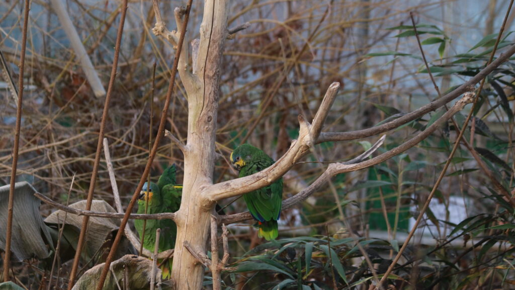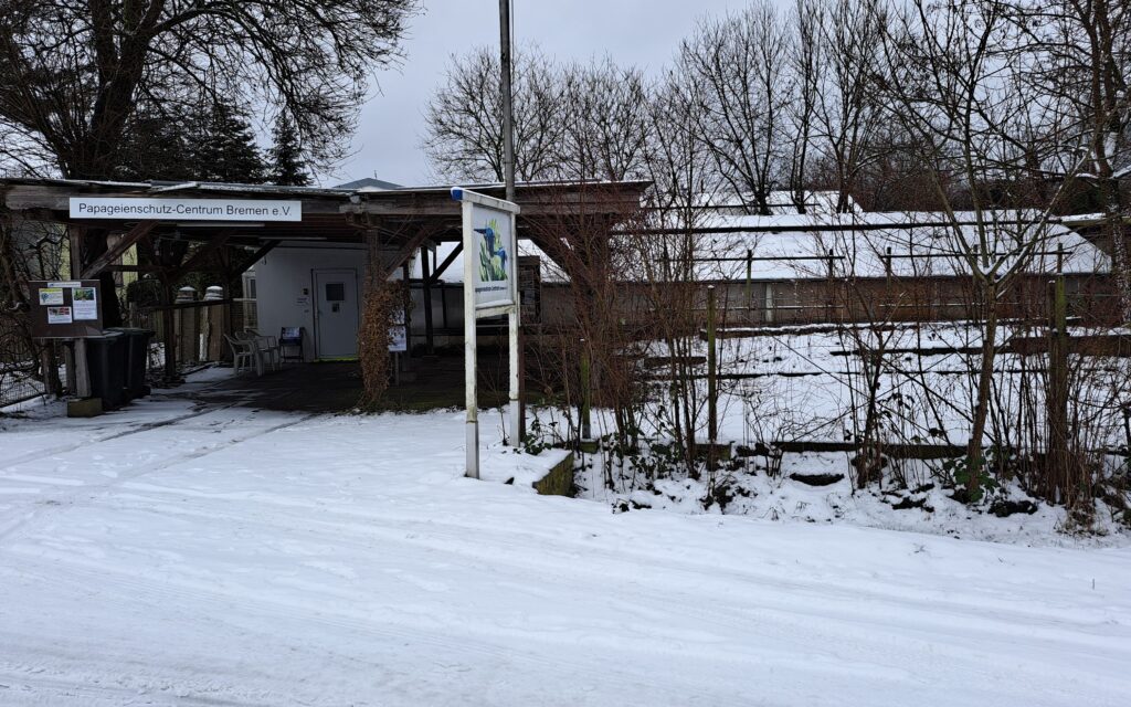 Ein in den letzten Jahren selten gewordener Anblick: Die schneebedeckten Dächer der Flughallen. Wegen der frostigen Temperaturen bleiben die Papageien zumeist in den beheizten Schutzhäusern. Allerdings gibt es einige Papageien, insbesondere Amazona-Papageien, die hin und wieder einen Ausflug in den nicht beheizten Bereich ihrer Flughalle machen und auf den kahlen Bäumen eine Abkühlung suchen, wie z. B. die beiden Venezuela-Amazonen ‘Robby’ und ‘Nala’.