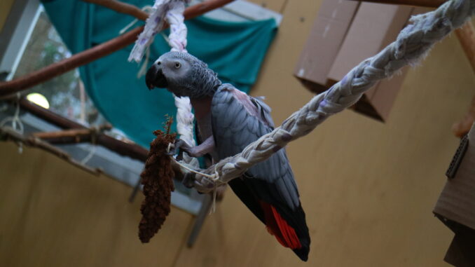 Das Erarbeiten von Futter bietet den Papageien vor allem in den Wintermonaten Abwechslung. Hier haben die Tierpfleger/innen Kolbenhirse an einem Baumwollzopf gehängt. Durch eine geschickte Balance und Kraftaufwand hat Nelly die Hirse erreicht