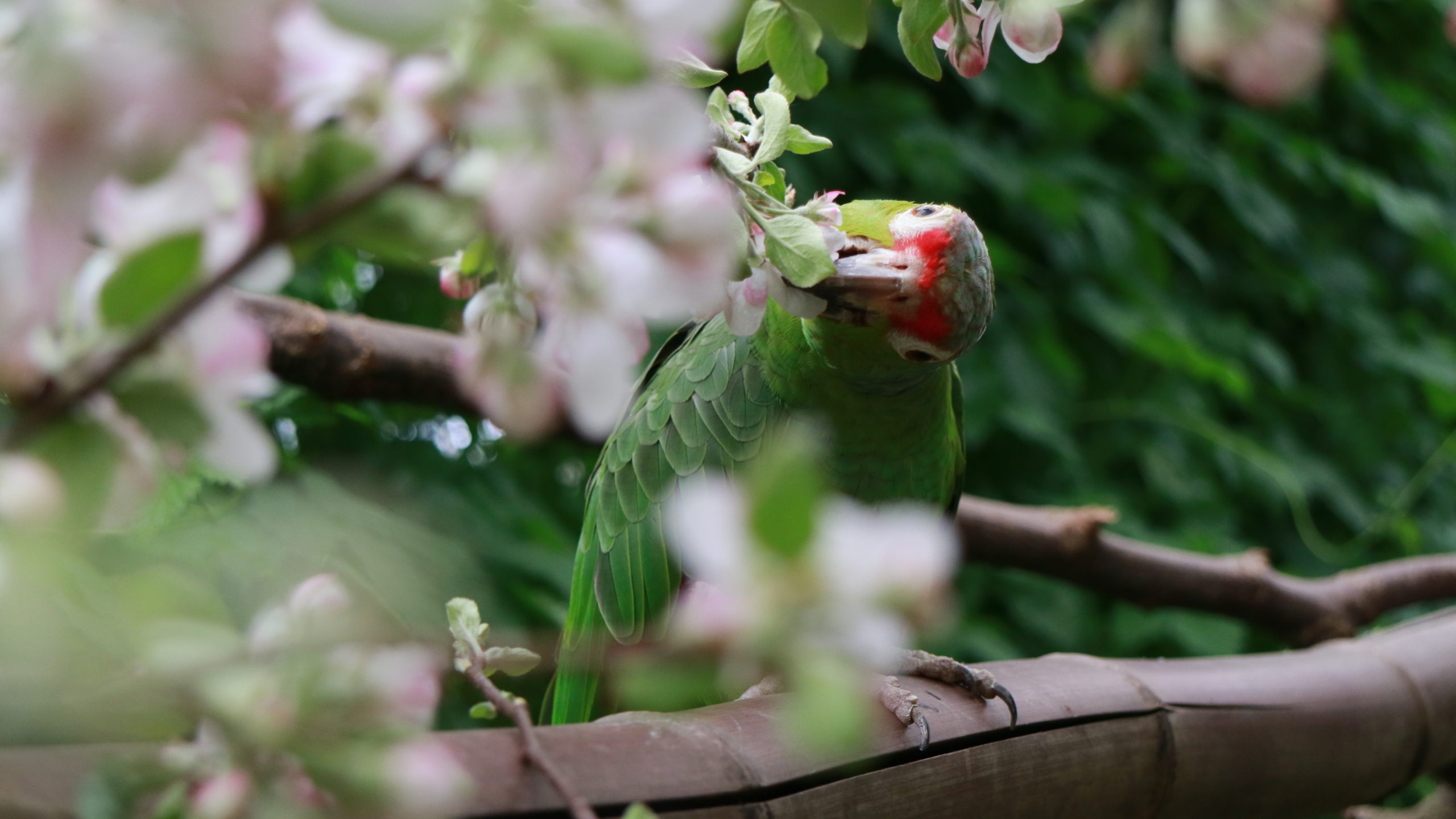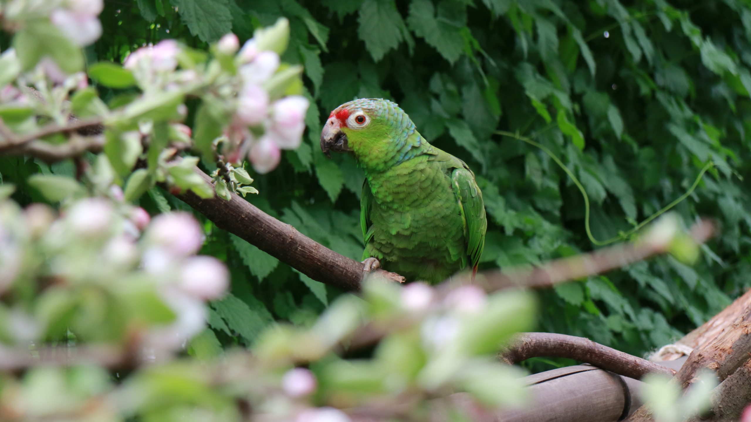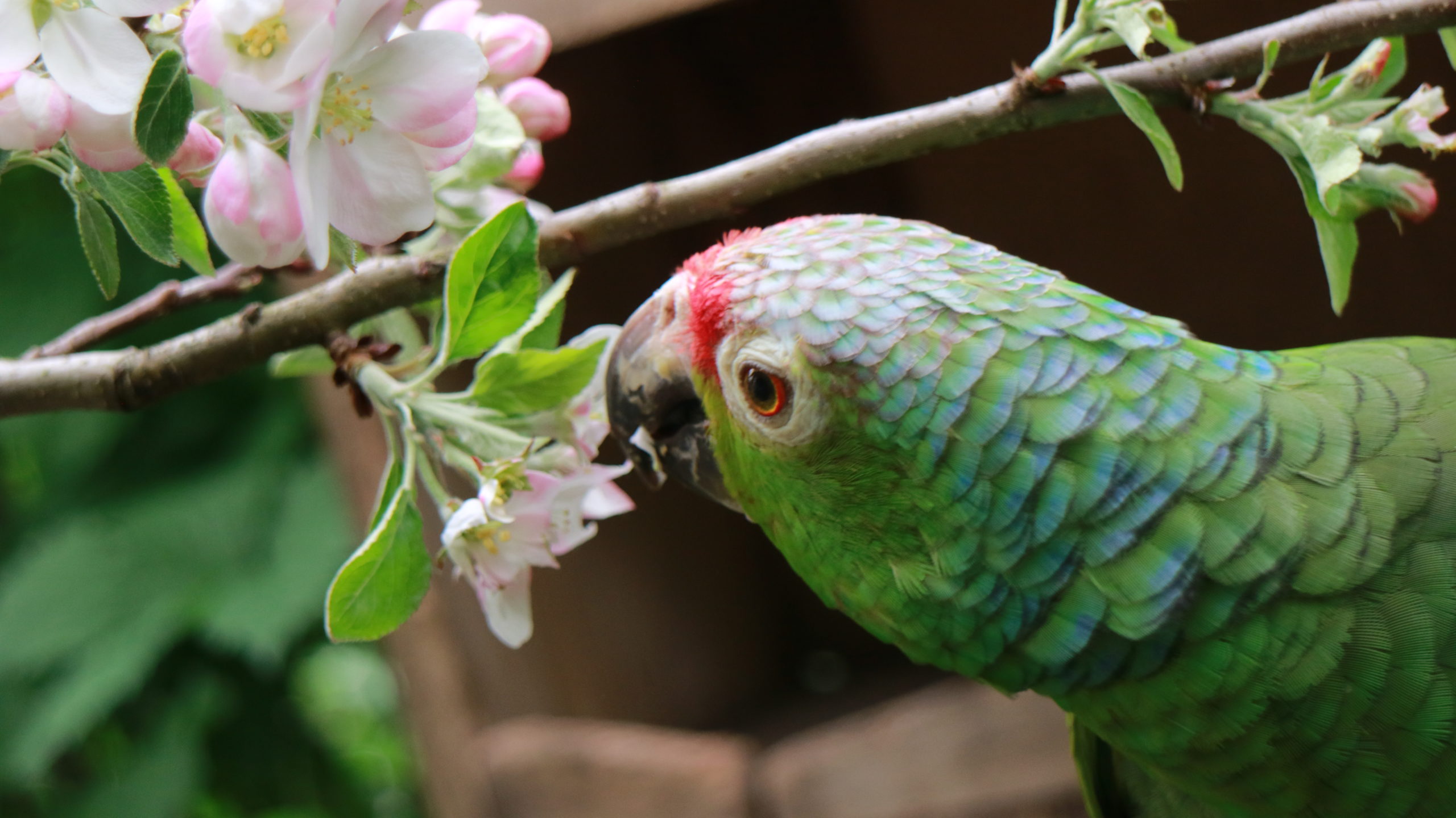 Fidelio im blühenden Apfelbaum 16. April 2025 Zur Übernahme einer Papageien-Patenschaft bitte hier klicken!